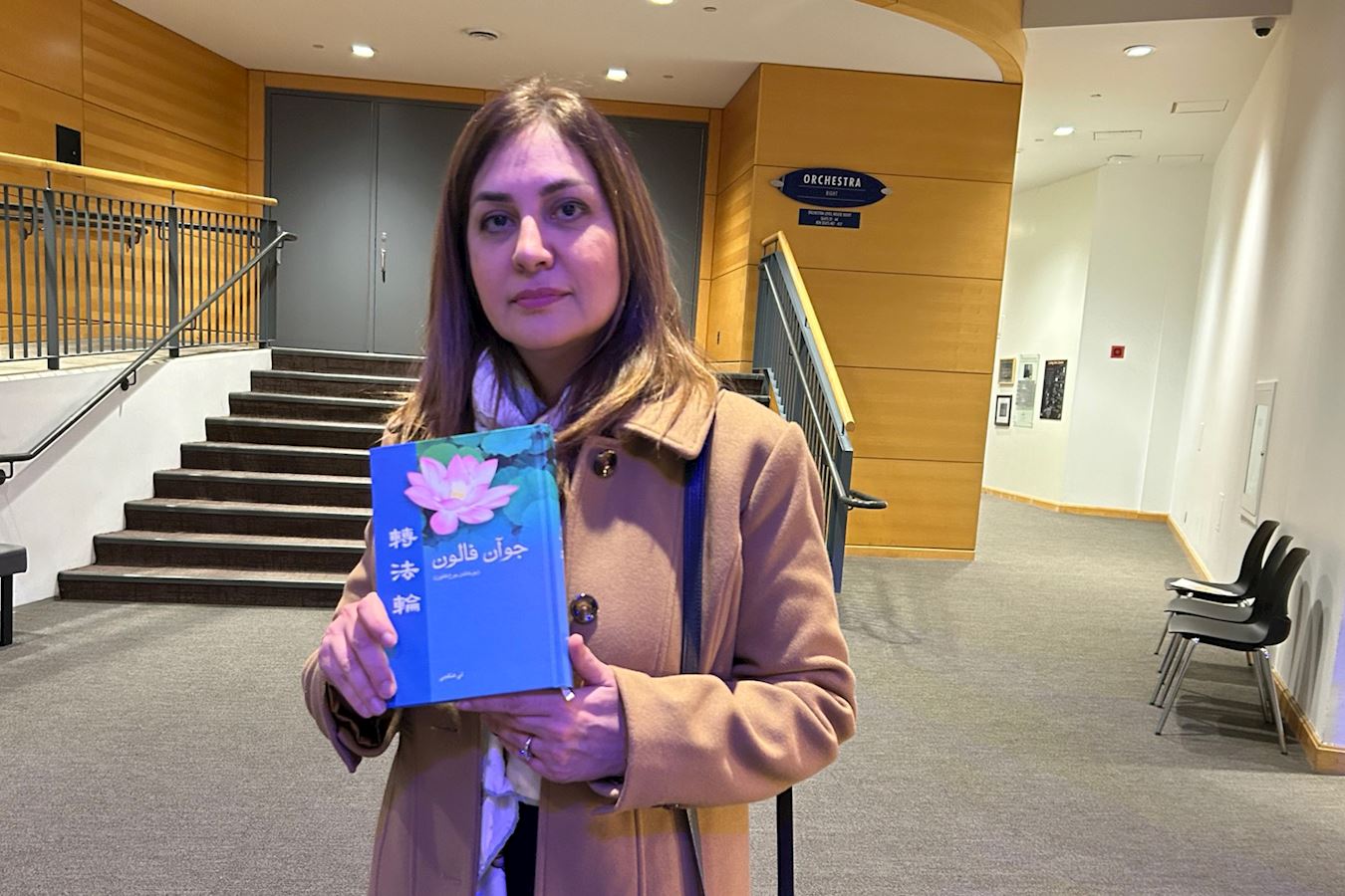 ![]() 圖11:二零二五年三月二十二日晚,加拿大約克大學獸醫博士後研究員米娜(Mina H),觀賞了神韻在加拿大密西沙加市的演出,現場購買了一本《轉法輪》。(大紀元) |