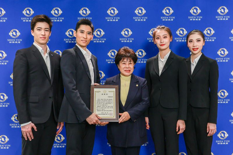 圖5:二零二五年五月一日晚,大邱壽城區議會議長曺奎化在大邱市觀賞了神韻演出,並頒發感謝狀。圖為曺奎化與神韻藝術家合影。(大紀元)