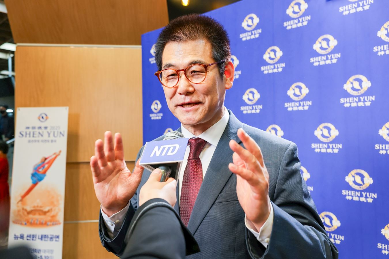 '圖9:二零二五年五月七日下午,韓國民族文化研究院院長、歷史學博士沈伯綱在春川觀賞了神韻演出。(大紀元)'