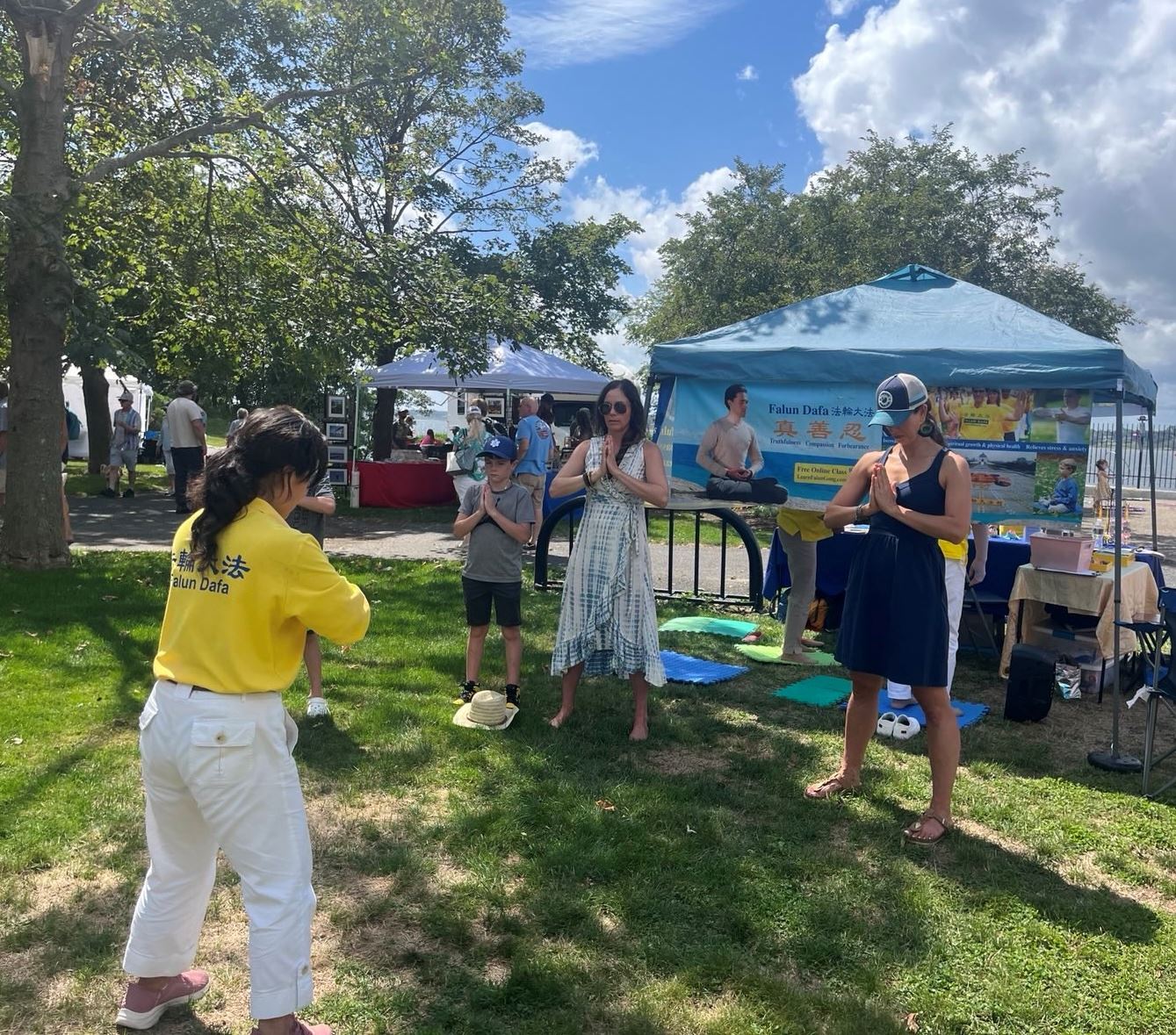 學員們在攤位上派發法輪功真相傳單,展示優美舒緩的法輪功功法,與公園的美麗景致相融。在夏末河畔的優雅和閒靜中,民眾們兩兩相繼而來,有的接到大法傳單後會主動問一些問題,想深入了解大法,了解迫害真相,有的表示要學煉功法。