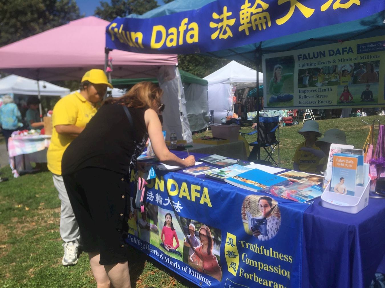 有一位五十多歲的西人女士,她經過學員的展位時,學員遞上一份傳單。起初這位女士不理解怎麼回事,學員跟上前說:「法輪功被中共迫害至今已經26年了,中共利用美國司法系統和媒體系統攻擊法輪功。我們在這裏徵簽,想讓美國人知道共產黨是反傳統的,是惡的,攜帶的是不好的能量,而法輪功弘揚的是真善忍,教人做好人,是正的,與共產黨正好相反,我們希望美國人能認清是非,明辨善惡。」