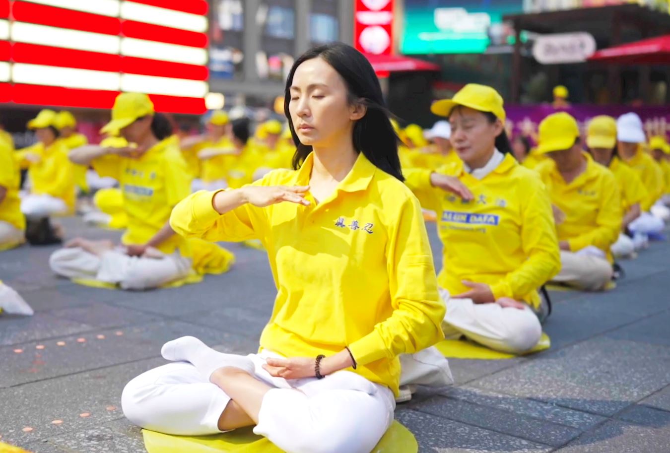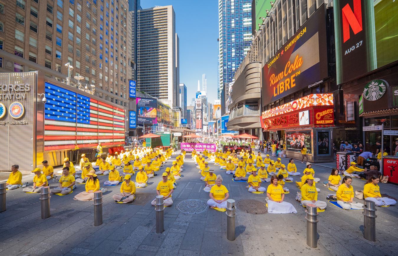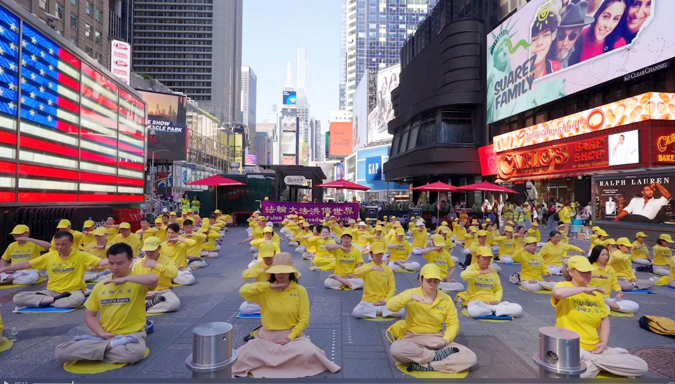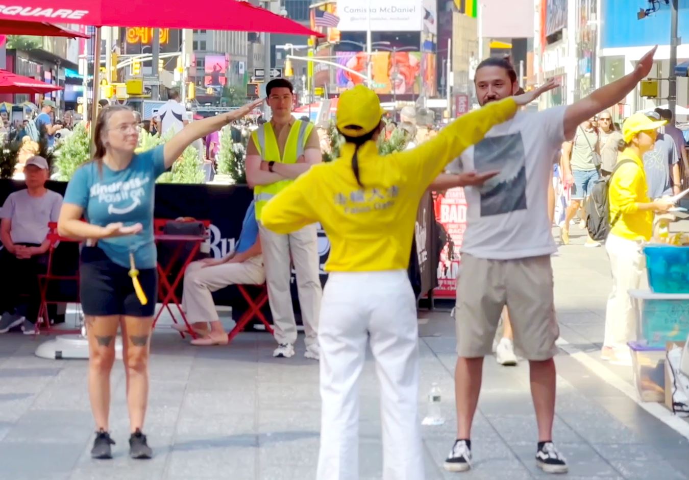 繁華喧鬧的時代廣場上,悠揚的煉功聲中,法輪功學員穿著黃色T恤整齊排開,靜靜地煉著法輪大法的五套功法。這份難得的祥和與寧靜吸引了眾多路人駐足觀看,不少人拿著手機拍照錄影,還有人接過傳單閱讀,並有人當場學功。人們贊同真、善、忍的價值觀,認為這正是全世界需要的。