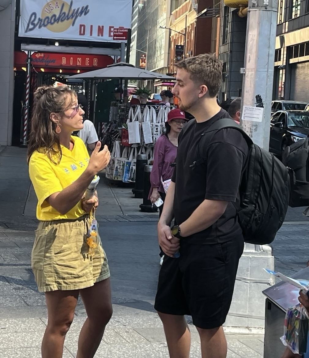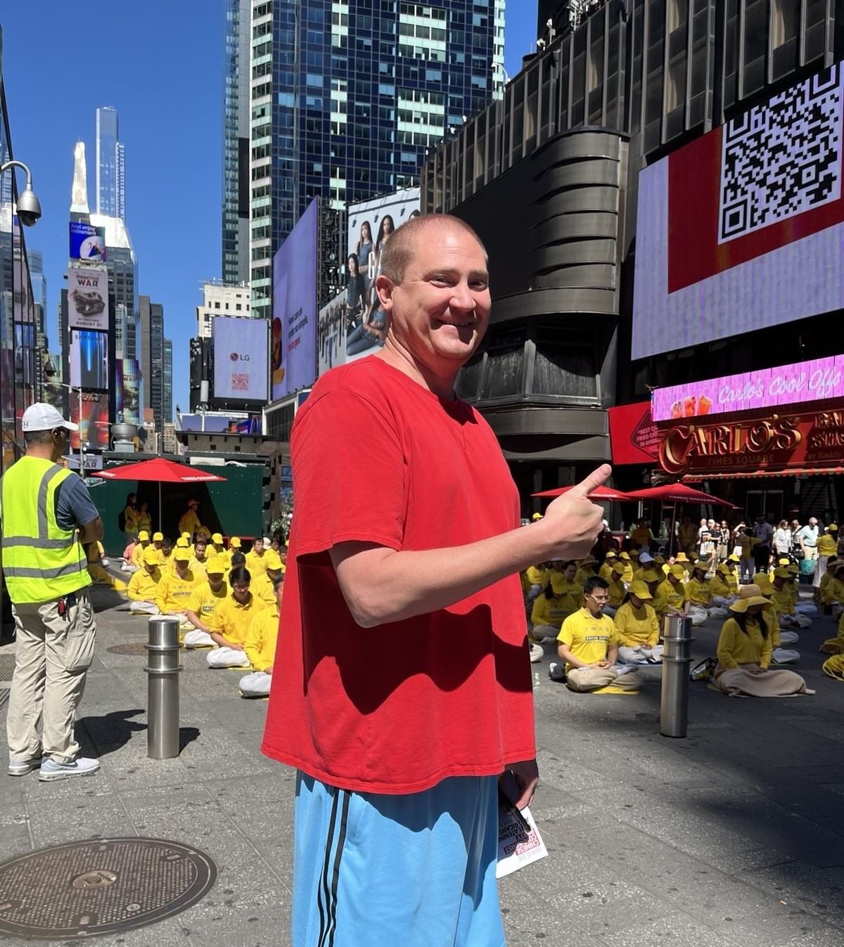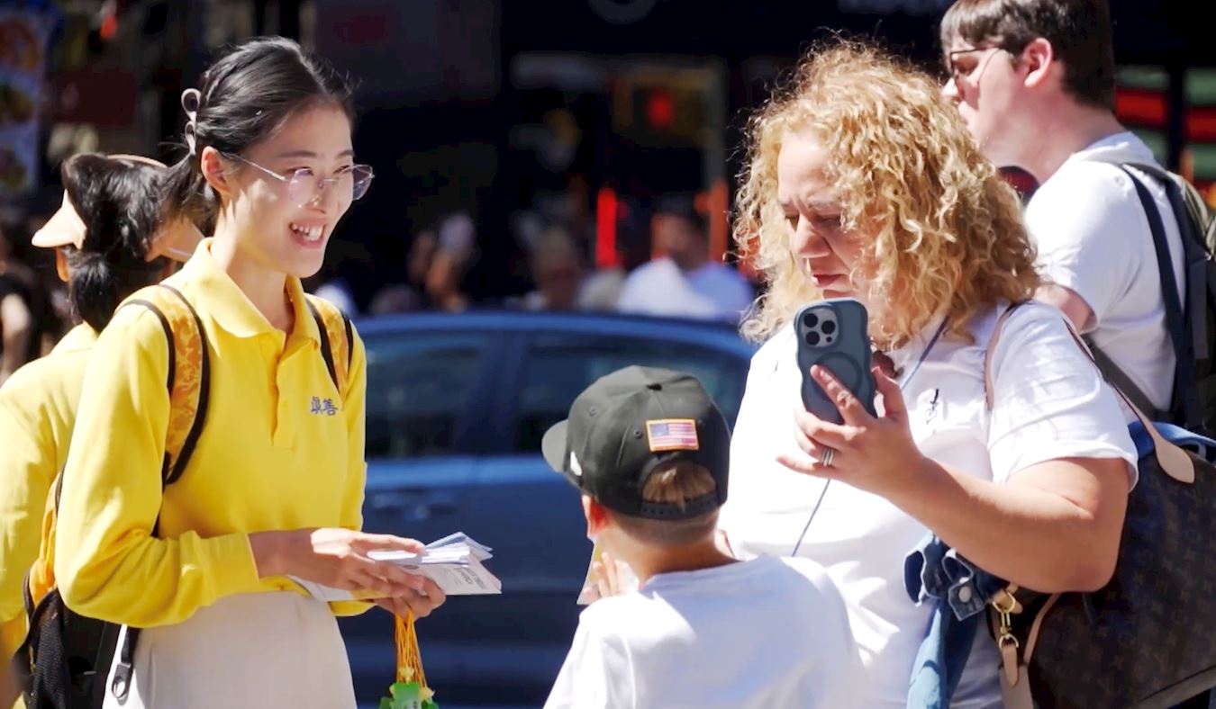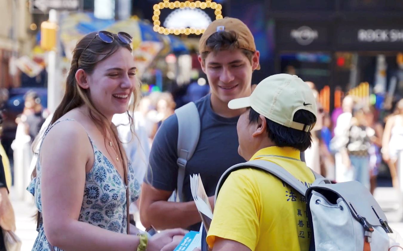 「這真的很美妙,你們在做的事情非常棒。這是一種很好的傳播方式。你們選擇在時代廣場這樣的重要地點,很難被忽視。這真的是很好的教育。」 甘地說,「要對其他人善良,這真的很美。他們所作所為,真的太好了。我拿到一張傳單,我會好好閱讀反思,也確保我的孩子也看過。」