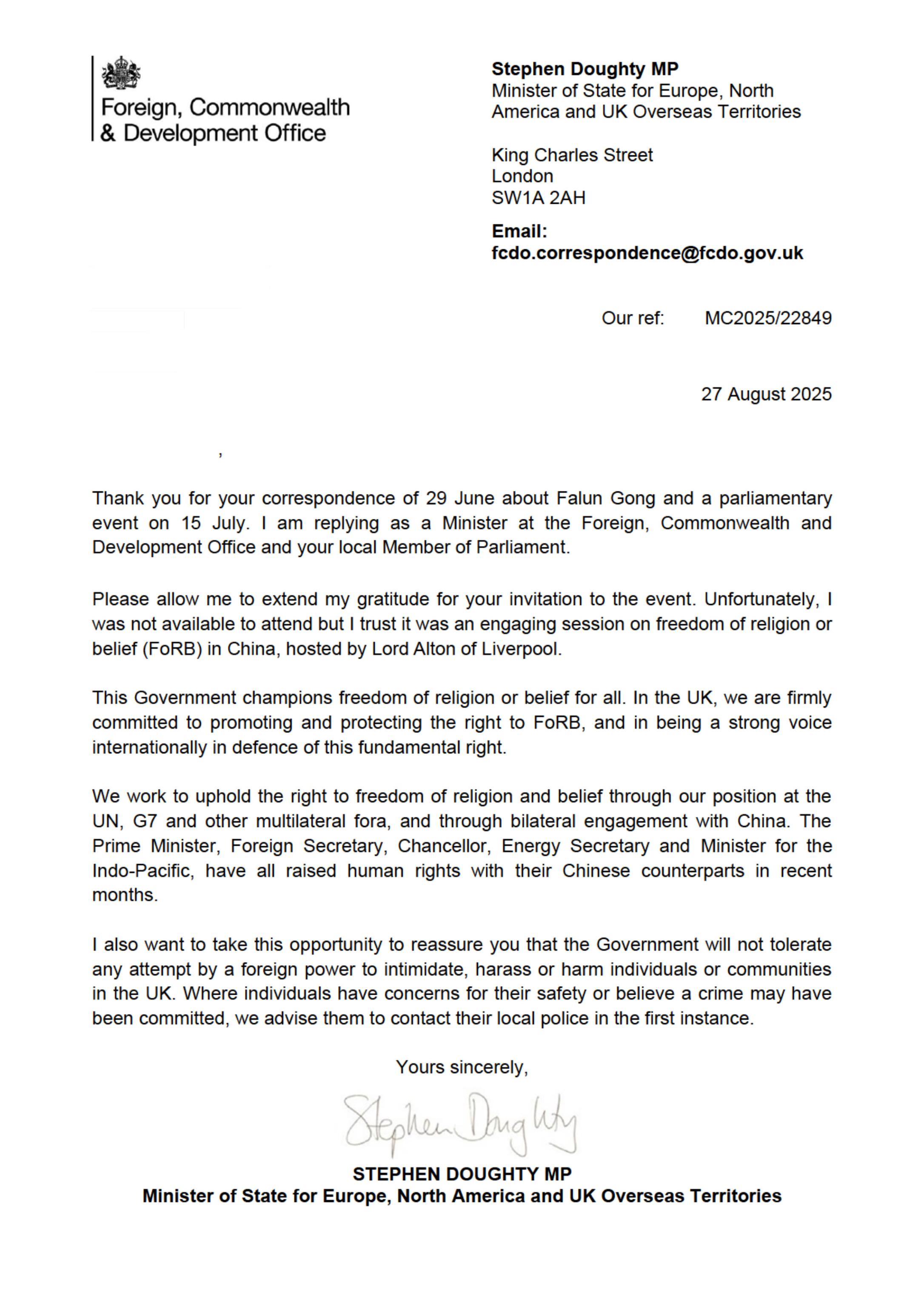 他強調:「你所提出的關於俄羅斯與中共在此類迫害問題上關係日益緊密的擔憂,也為許多人所關注。我非常重視這些問題,並會將你的關切轉達給英國外交發展部。我們的目標是確保英國政府在國際上持續推動宗教自由與人權。」