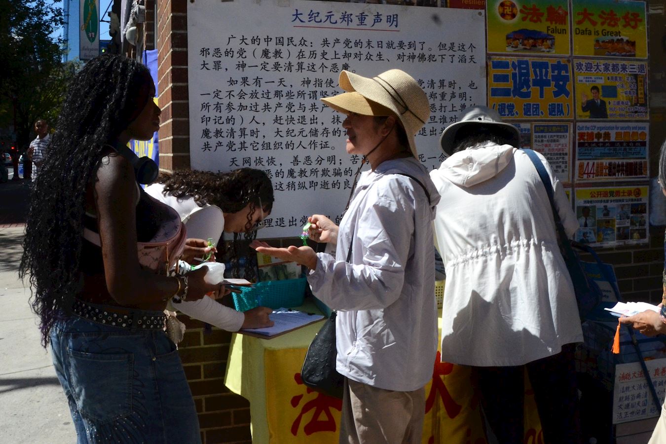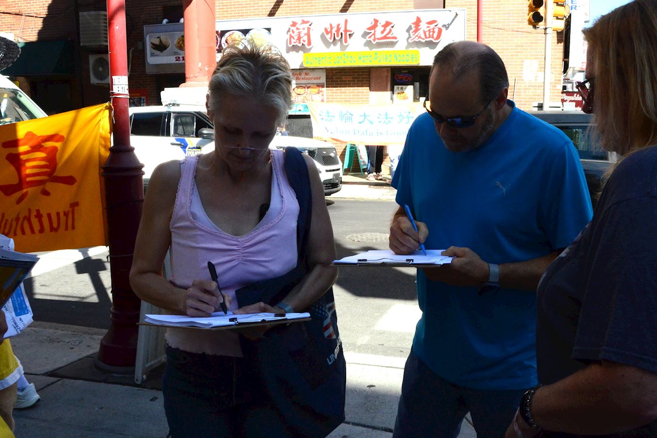 當天很多人是第一次聽聞中共迫害法輪功,甚至活摘法輪功學員器官的罪行,他們在感到震驚之餘,當即簽名要求制止中共的罪行。