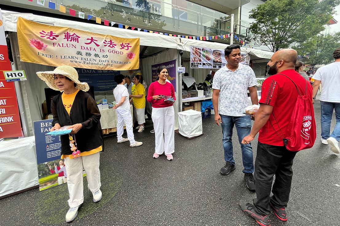 法輪功學員還在舞台上表演了法輪功舒緩、優美的五套功法和中國的傳統舞蹈。學員們在展位上向熙熙攘攘的遊客介紹法輪功,希望把真、善、忍的美好價值傳遞給世人。幾天來,不斷有人駐足了解真相,也有人當場學煉功法動作。