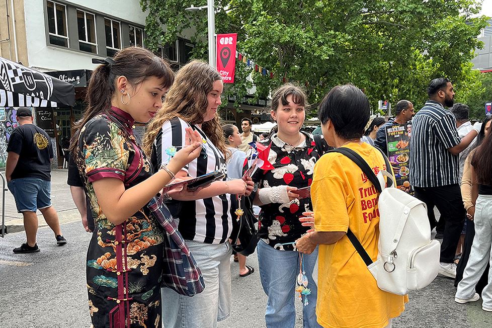 '圖5~7:法輪功學員在澳洲多元文化節展位前傳遞真相、分享修煉真善忍高德大法的美好。'