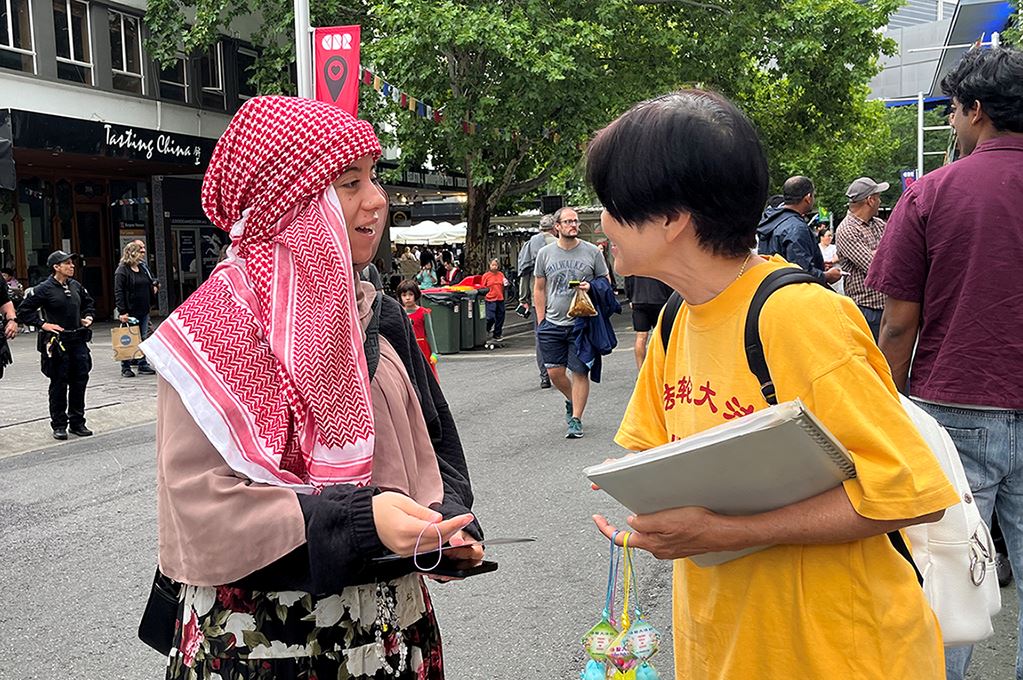 圖5~7:法輪功學員在澳洲多元文化節展位前傳遞真相、分享修煉真善忍高德大法的美好。