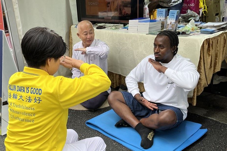 糕點師瓦斯瓦﹒卡布耶在多元文化節上看到法輪大法的展位,停下腳步了解詳情,並嘗試了第五套功法。他表示,學煉功法的時候感覺到很強的能量。