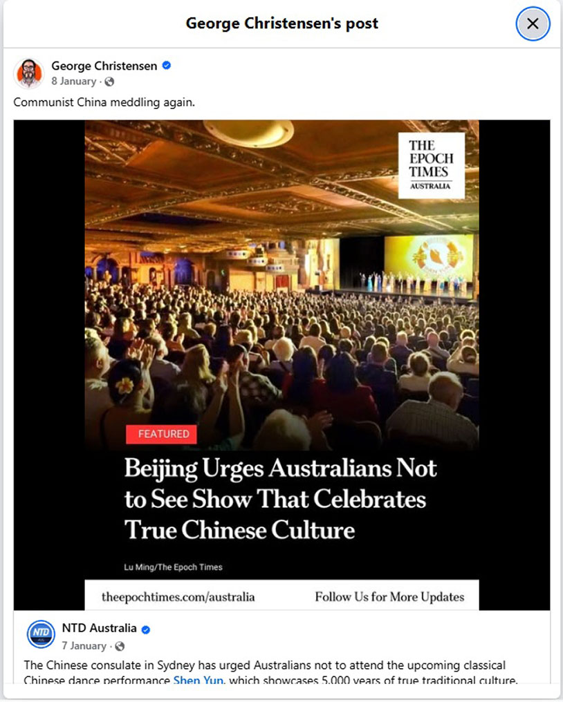 圖3:澳洲前聯邦議員喬治・克里斯滕森(George Christensen)一月八日轉發了新唐人電視台的相關報導,引發粉絲熱議。
