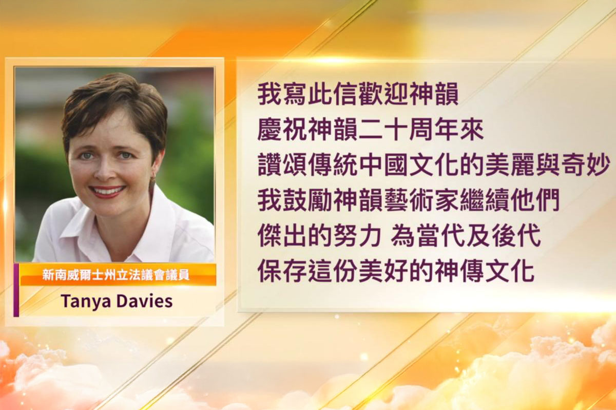 圖7:澳大利亞新南威爾士州議員坦婭・戴維斯(Tanya Davies)恭賀神韻藝術團成立20週年,讚揚神韻對藝術做出的傑出貢獻。(新唐人電視台)